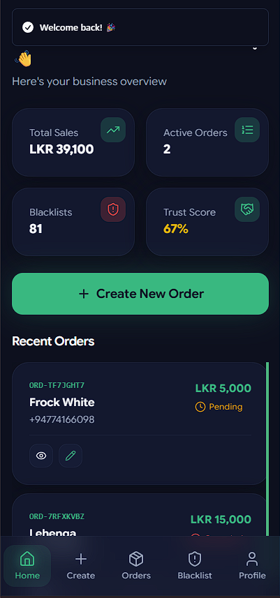 An intuitive dashboard was built for sellers to monitor orders, track risky customers, and gain actionable insights in real time.